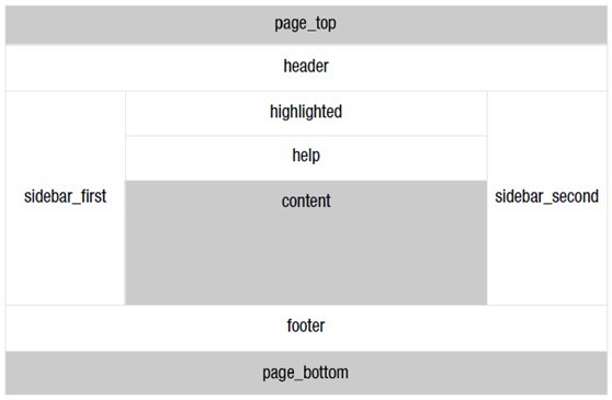 如图15-10所示,展示的Drupal默认区域是一个标准的三栏布局。灰色的区域是必须的,而其余的是可选的。Header、sidebar_first、sidebar_second、footer是布局方面的区域。page_top和page_bottom是特殊区域;它们将在本章的“隐藏区域”部分讨论。