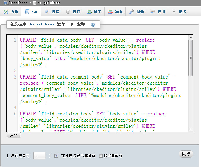 这里我使用的是phpmyadmin来操作的,首先是要进入phpmyadmin的界面,搜索想被替换的字符:“modules/ckeditor/ckeditor/plugins/smiley”: